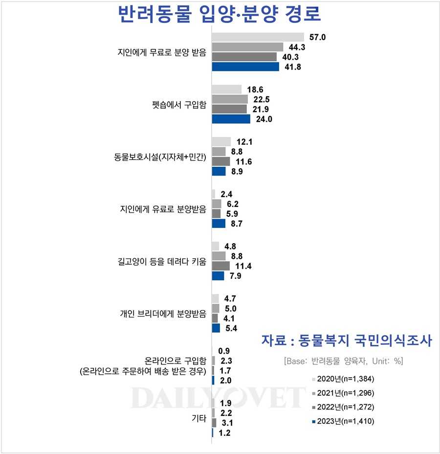실제로 동물복지에 대한 국민의식조사 결과에 따르면, 반려동물 입양 및 분양 경로 통계는 다음과 같다.