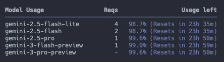 Gemini CLI를 사용하다보면 사용량이 얼마나 남았는 지 확인하고 싶은 경우가 있다.