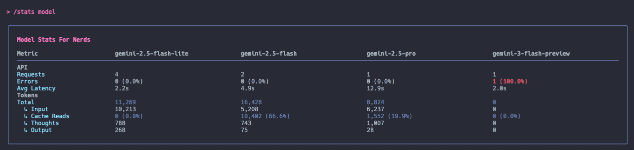 Model Stats For Nerds 라는 한 줄도 웃긴데, 각 모델 별 Input, Cache Reads, Thoughts, Output 별로 구체적인 수치도 확인할 수 있다.