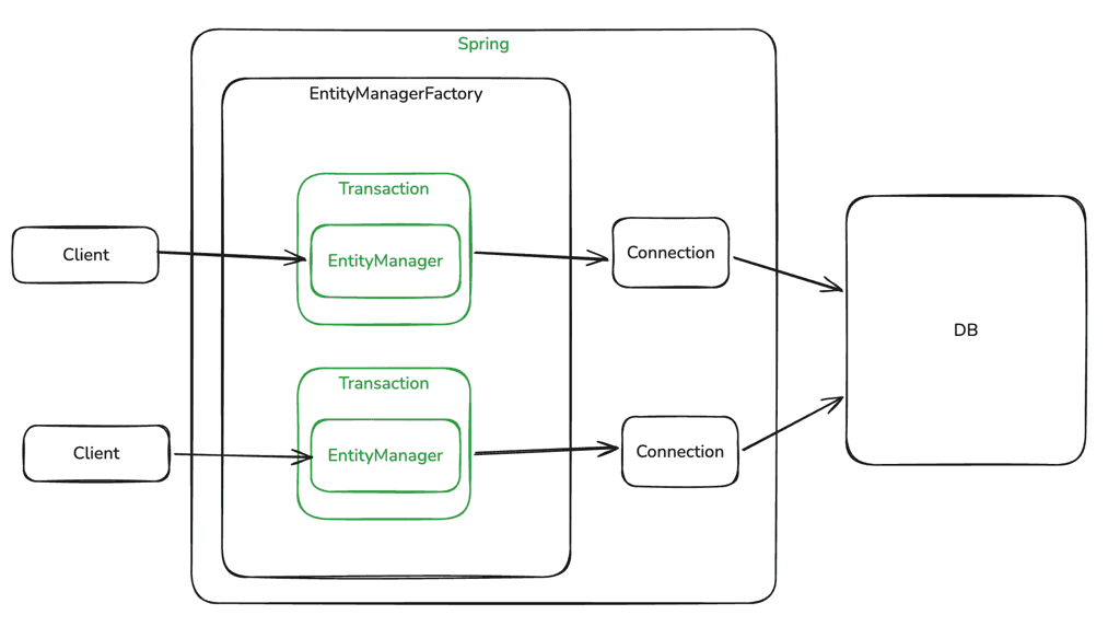 - Client의 요청마다 EntityManager를 생성하고, 하나의 EntityManager는 하나의 Connection을 사용합니다.