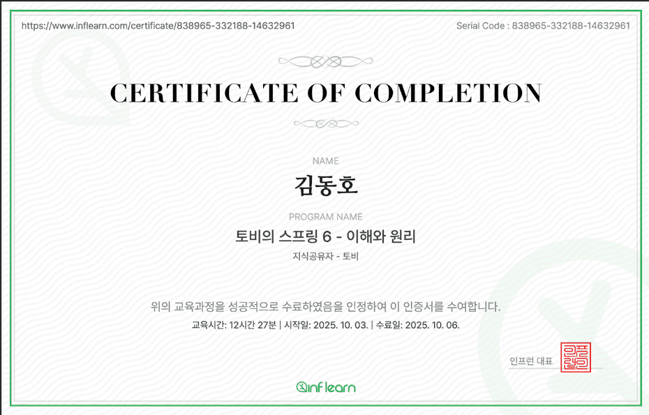 긴 추석 연휴동안 별 다른 계획이 없던 나는, 인프런에서 진행하는 향로와 함께하는 추석 완강 챌린지를 보자마자 홀린듯이 신청했다. 40% 할인 쿠폰도 줘서 듣고 싶었던 강의를 모두 결제했고, 그 중에 하나가 토비의 스프링 6 - 이해와 원리다.