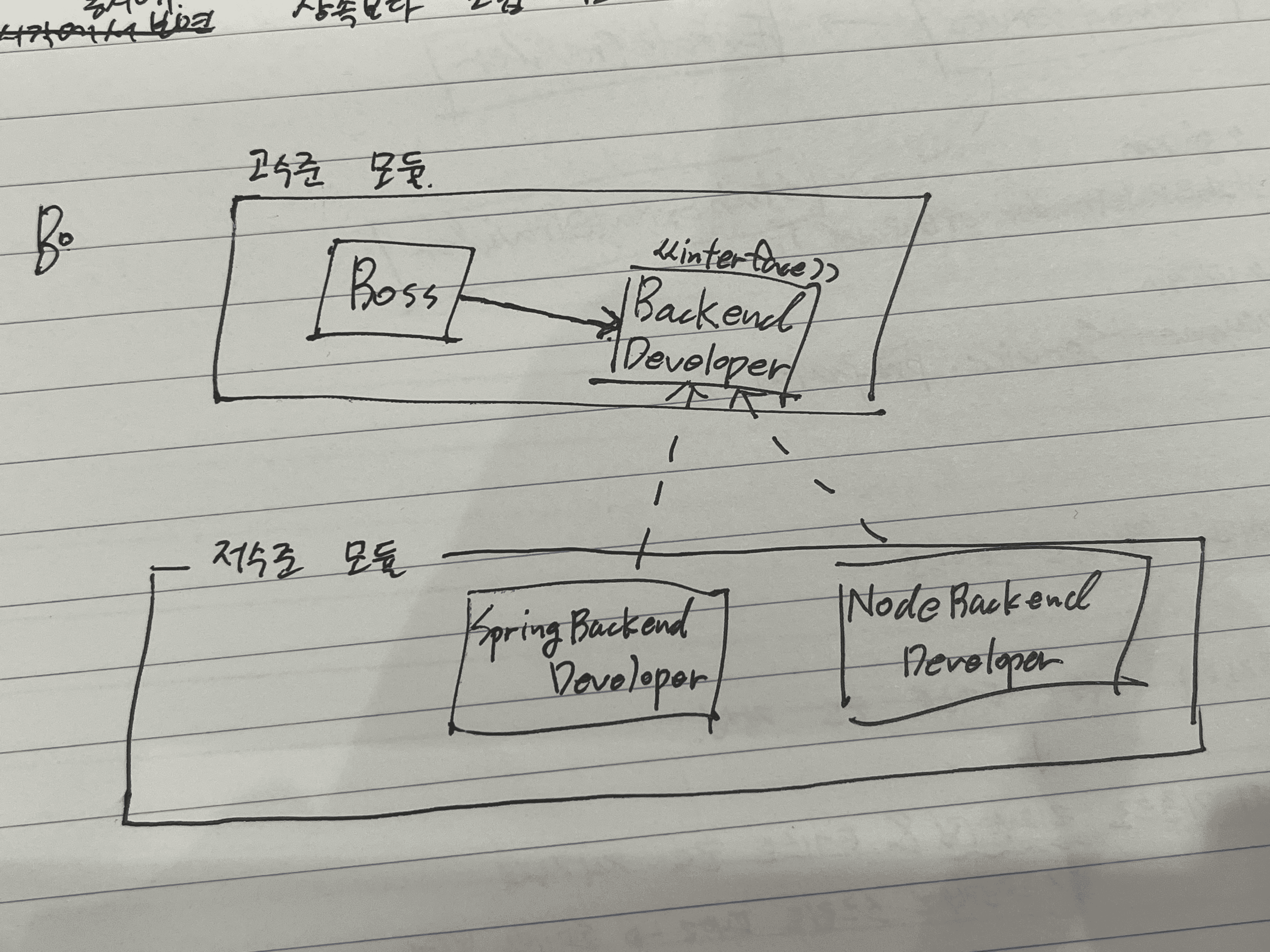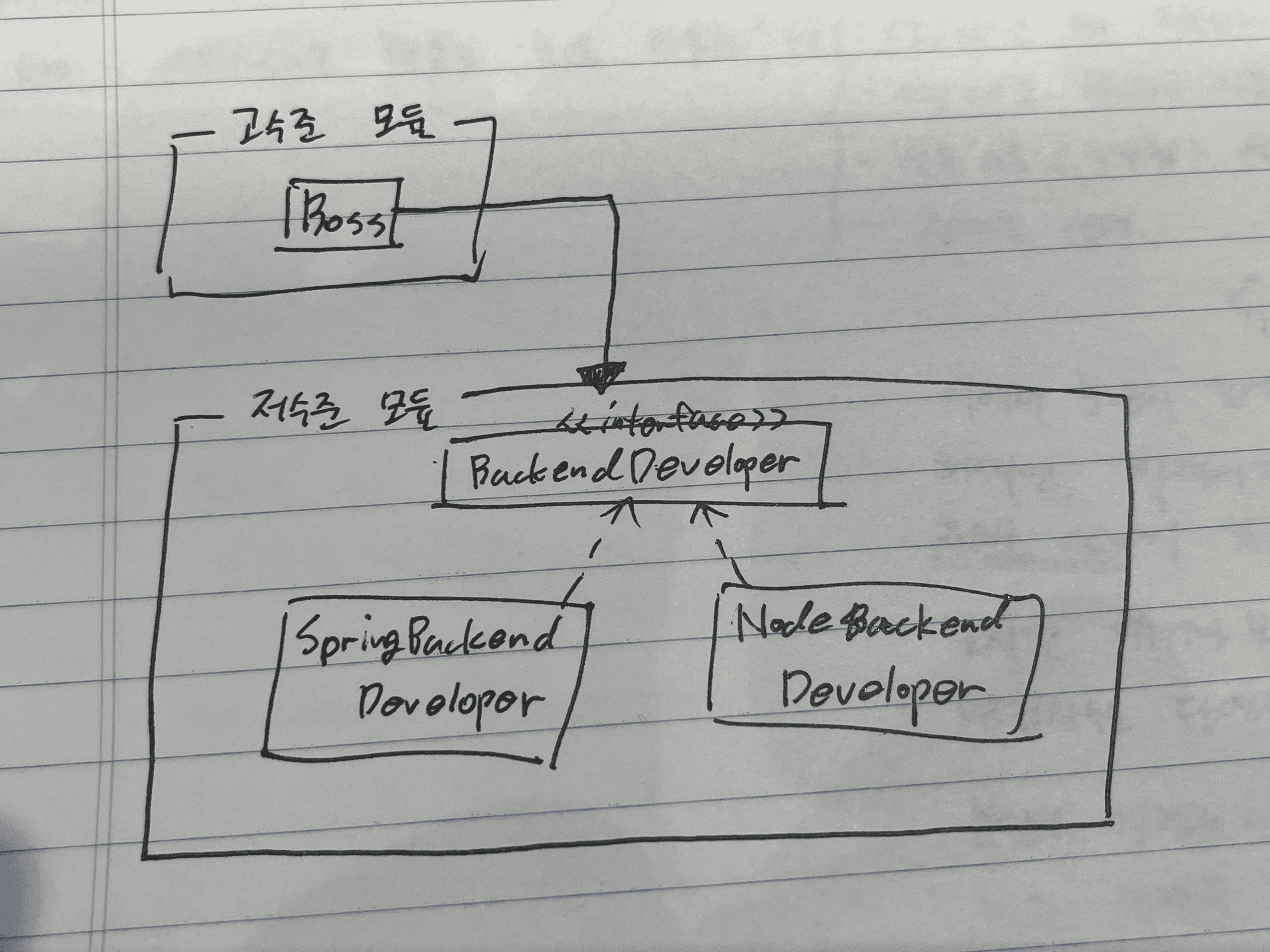 고수준 모듈인 Boss가 저수준 모듈인 BackendDevloper를 의존하고 있다.