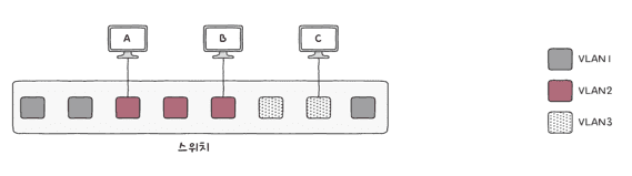 이때 한 대의 스위치로 VLAN을 구성하여, 여러 개의 논리적인 LAN을 나눌 수 있습니다.