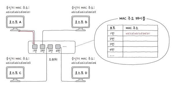 허브와 마찬가지로 스위치의 여러 포트에 호스트를 연결할 수 있습니다.